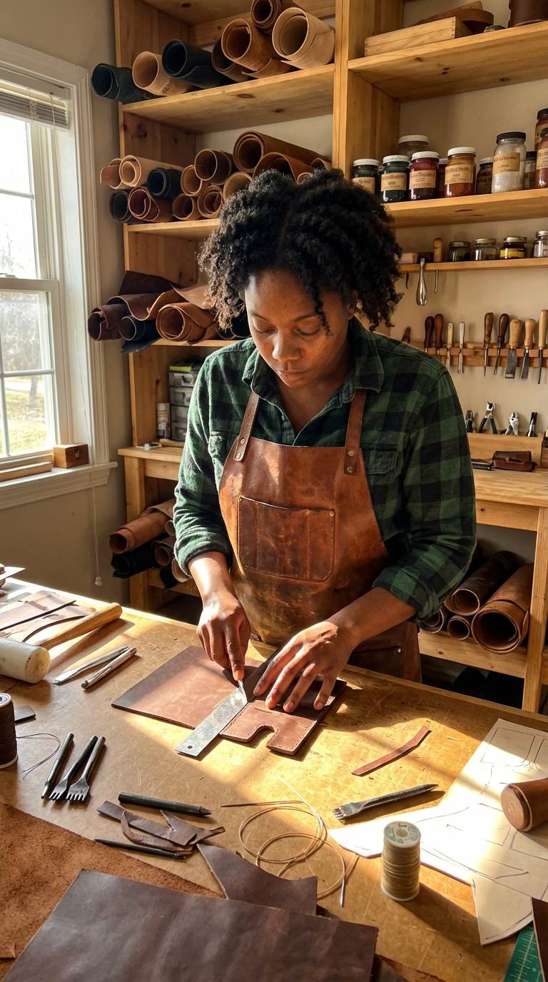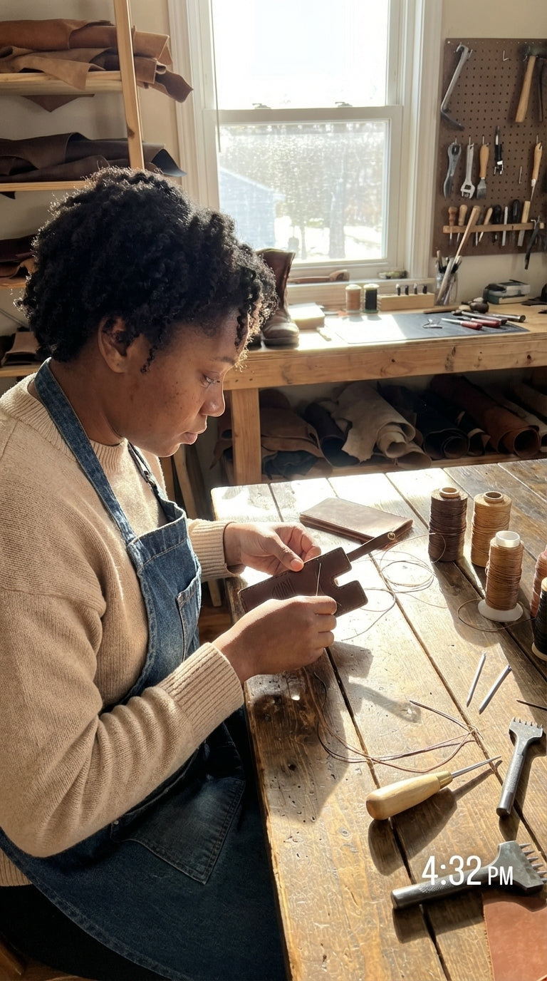 I craft every piece alone in my workshop. I cut the leather, shape the wings, and stitch every detail by hand. No factory, no assembly line — just me, my tools, and quiet focus.